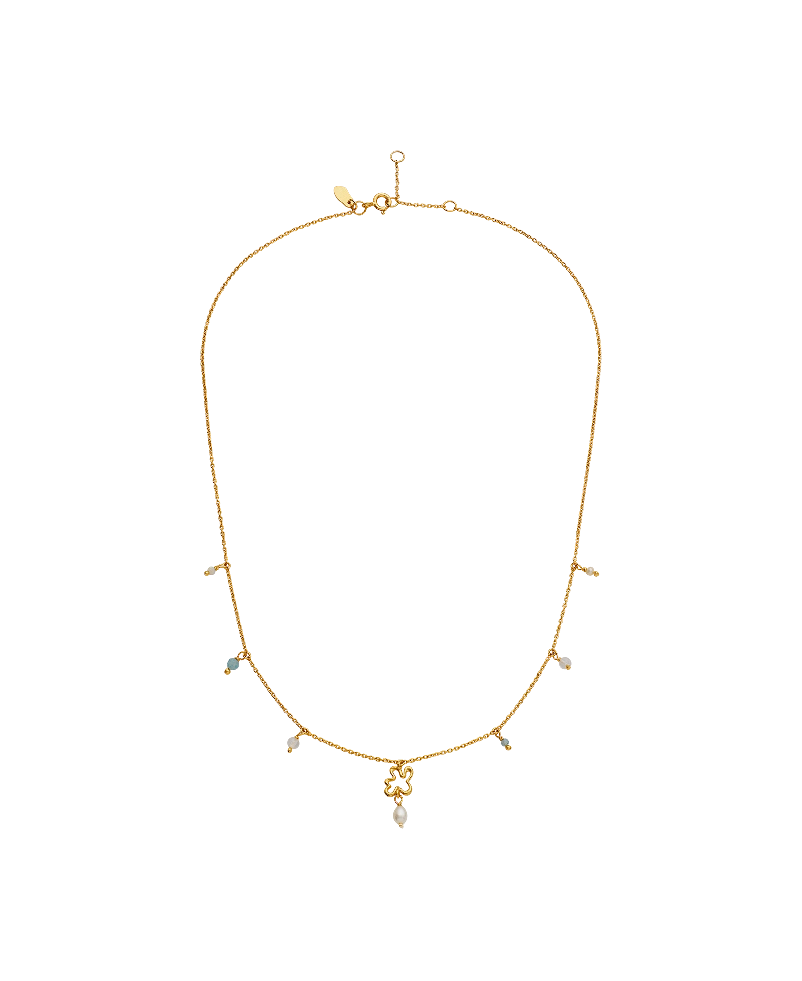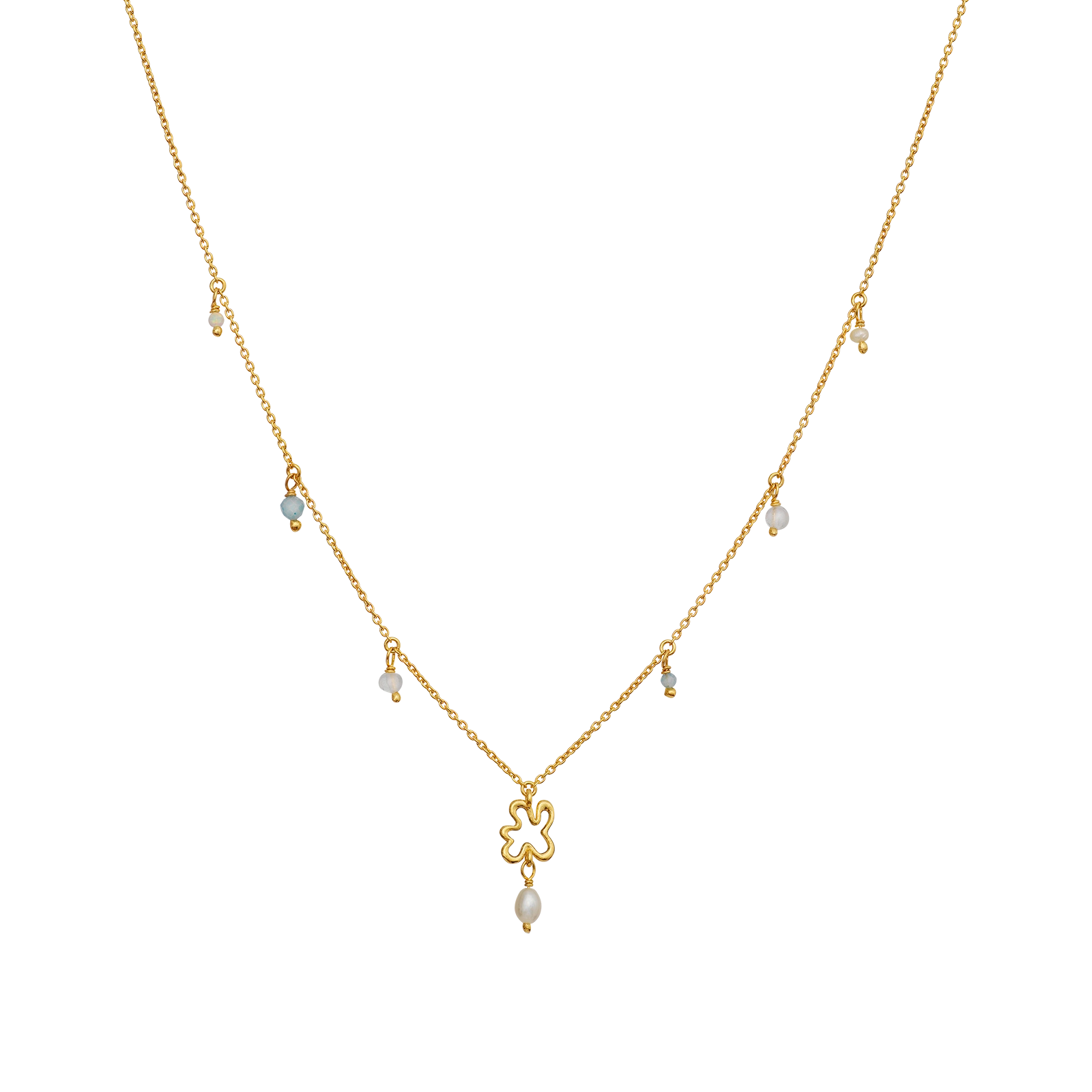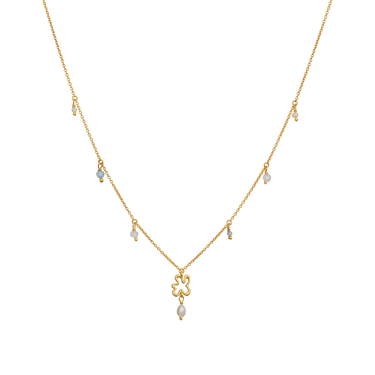 Designet af halskæden forener IGENs ikoniske swirl med Maanestens drømmende univers, hvor IGENs swirl samler sig i midten af kæden og afsluttes med en ferskvandsperle. Langs kæden er opal, regnbue månesten og akvamarin placeret, som er forbundet med månen og en rolig feminin energi.
