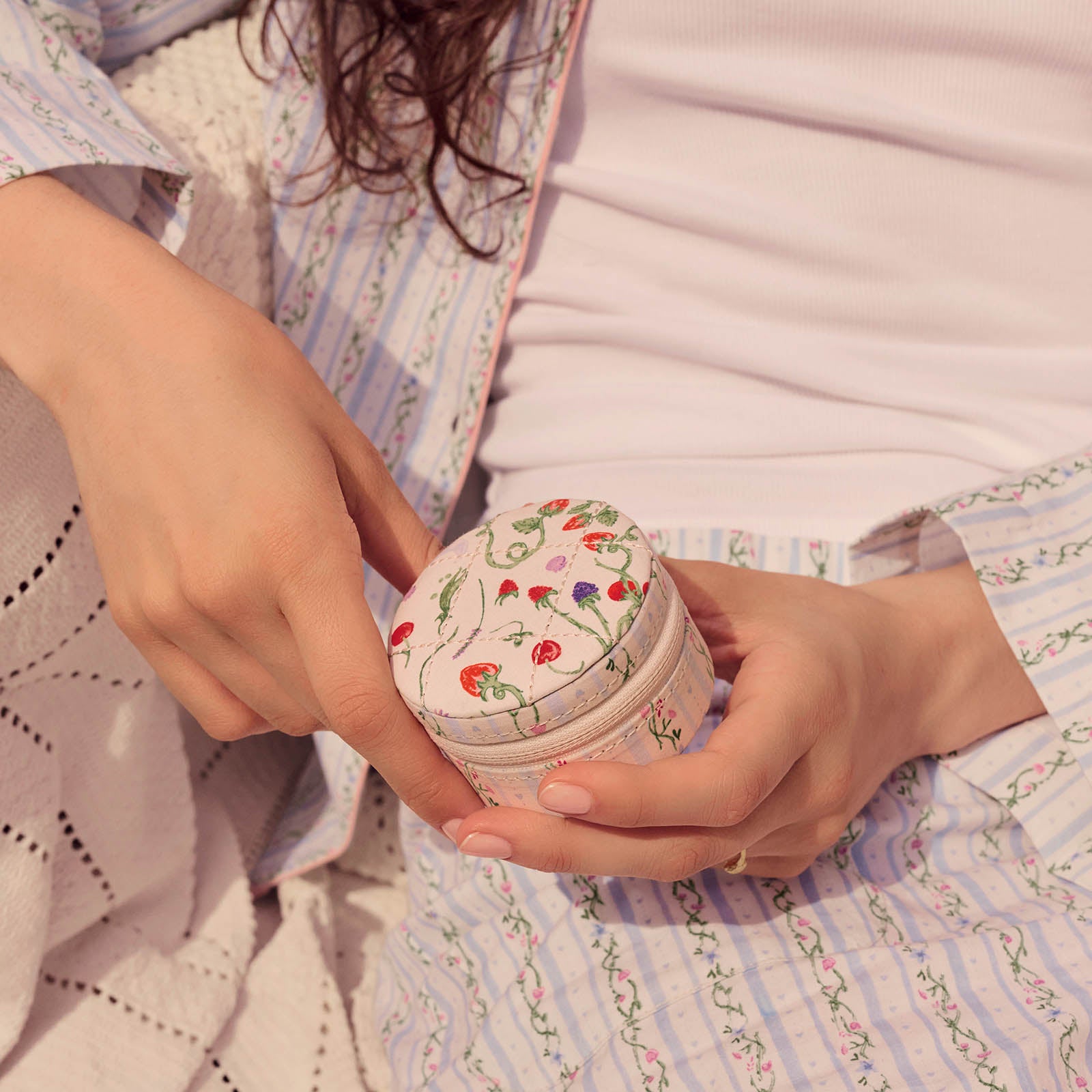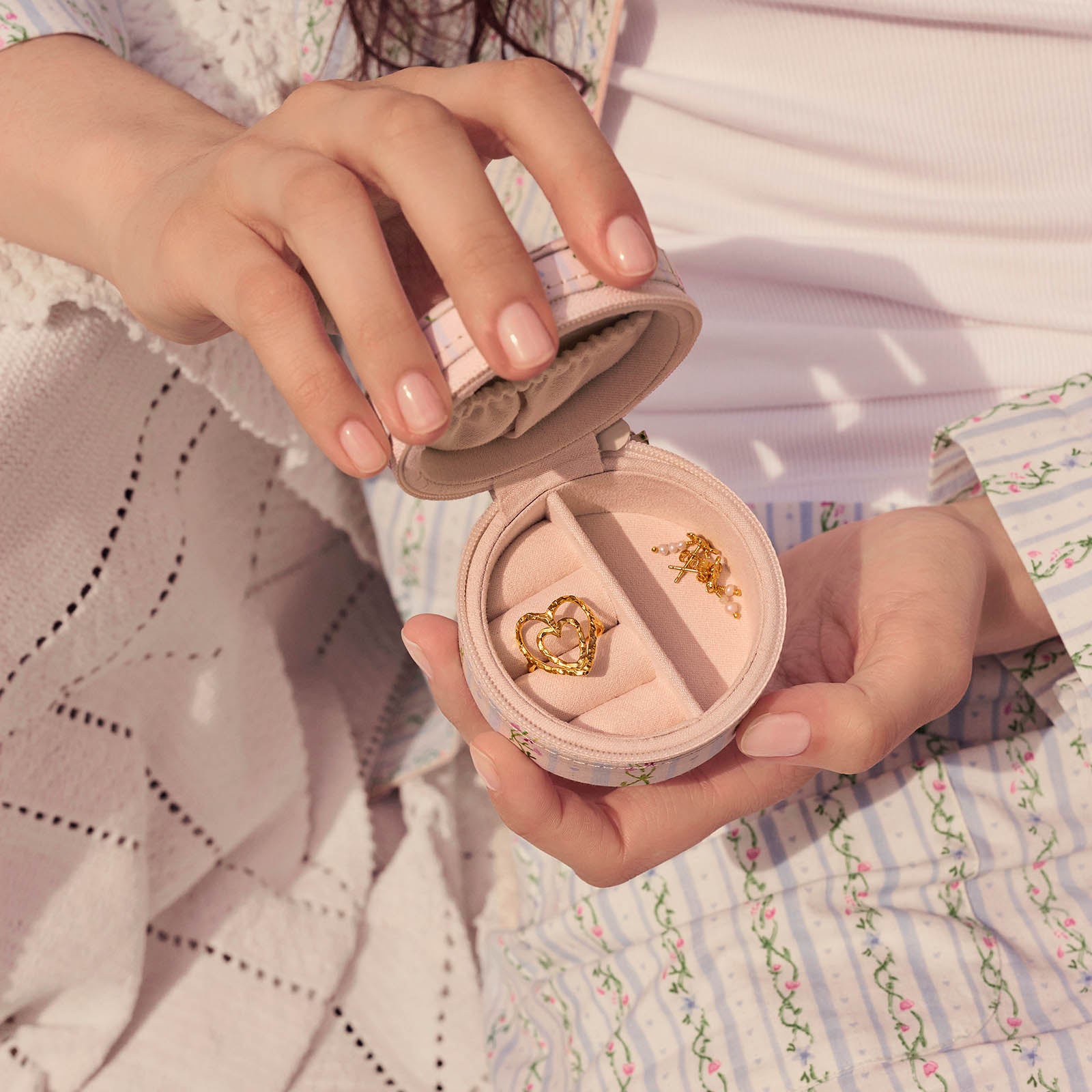 Vores lille, runde Smykkeskrin er ren sommernostalgi. Kompakt og nem at tage med, men rummelig nok til at passe på dine skattede smykker – og de strålende minder, de bærer.